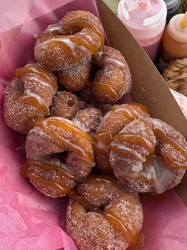 Our customizable topping bar lets guests create their dream donut with sprinkles, drizzles, candies, and seasonal favorites. We also offer specialty "him and hers" flavors or custom creations tailored to your event for an additional cost.