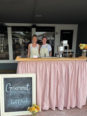 Our donut cart is more than just a serving station, it's a statement. Featuring our signature machine cart adorned with a bold red ticking line curtain and a coordinating topping cart, all topped off with our classic white umbrella. Whether your vibe is chic, classic, or fun, we'll tailor the setup to make your event unforgettable.